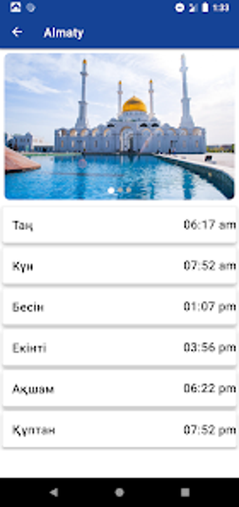 намаз уақыты를 사용하면 시민켄트와 알마티를 포함한 카자흐스탄의 다른 도시들의 기도 일정을 쉽게 찾을 수 있습니다. 이 앱은 기도 시간에 대한 정확하고 최신 정보를 제공하여 사용자가 그에 맞게 하루를 계획할 수 있도록 도와줍니다.